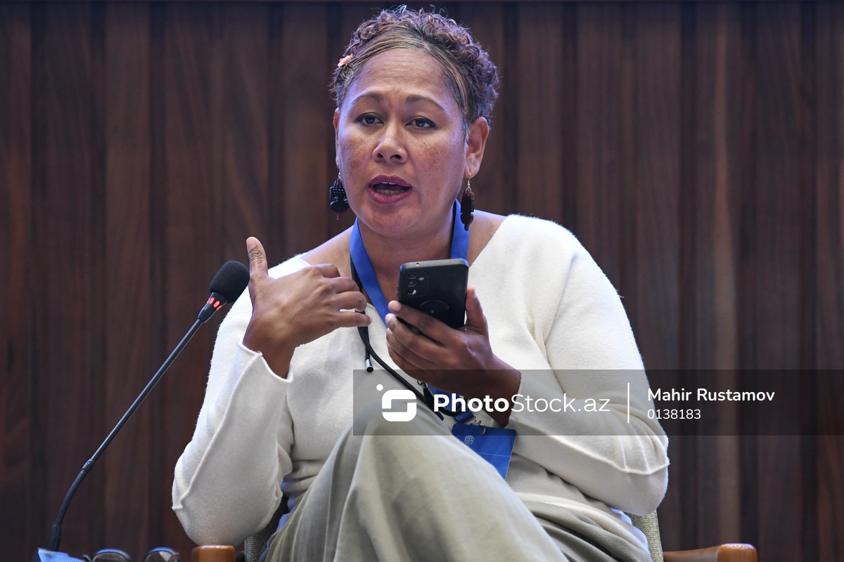"Neokolonializm və qlobal bərabərsizlik" mövzusunda beynəlxalq konfransda çıxış edən FLNKS-in siyasi bürosunun və Mouvement Océanien Indépendantiste (Yeni Kaledoniya) Məşvərət Şurasının üzvü Orian Sinkon-Trolyu.