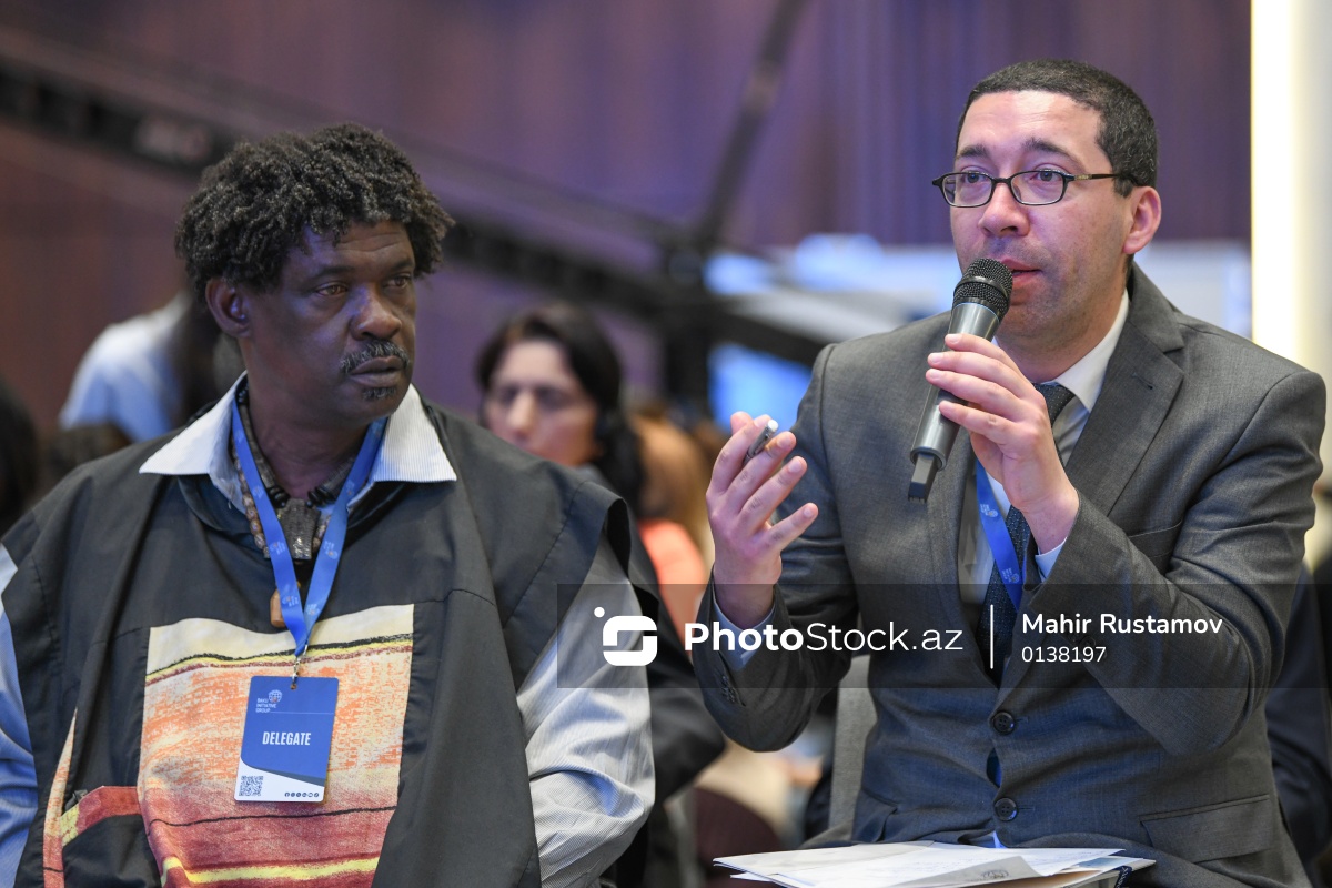 "Neokolonializm və qlobal bərabərsizlik" mövzusunda beynəlxalq konfransda iştirak edən Qlobal Təzminat Hərəkatının Prezidenti, Beynəlxalq Dekolonizasiya Cəbhəsinin katibi Jose Martin Jan-Pyer (sol) və Əlcəzairin Üç Universitetini təmsil edən fəlsəfə elmləri doktoru, antropoloq, politologiya sahəsində tədqiqatçı Hişam Daud (sağ).