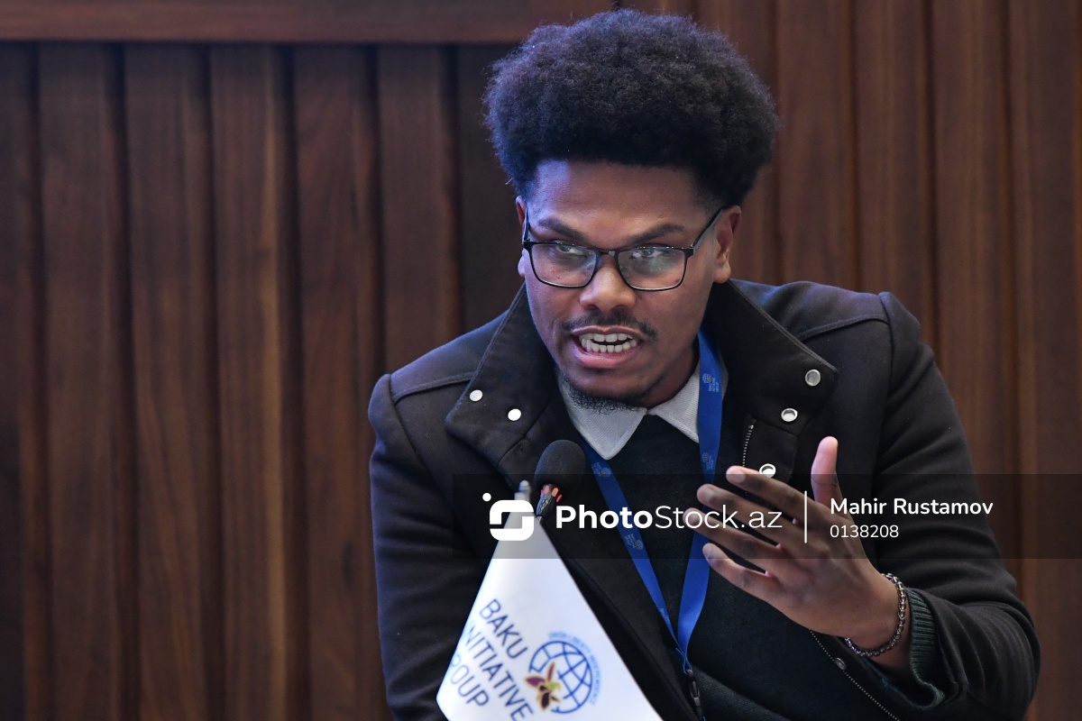"Neokolonializm və qlobal bərabərsizlik" mövzusunda beynəlxalq konfransda çıxış edən "Ka Ubuntu" hərəkatının sədri Romen Katambara.