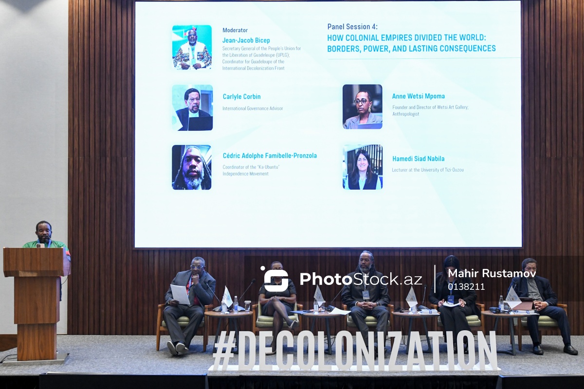 "Neokolonializm və qlobal bərabərsizlik" mövzusunda beynəlxalq konfransda iştirak edən (soldan-sağa) Martinika Ədalət Kollektivinin Kommunikasiya və Gənclər şöbəsinin nümayəndəsi Daniel Dubua, Qvadelupanın Azadlığı Naminə Xalq Birliyinin (UPLG) baş katibi, Beynəlxalq Dekolonizasiya Cəbhəsinin Qvadelupa bölməsi üzrə koordinatoru Jan-Jakob Bisep, "Wetsi" incəsənət qalereyasının təsisçisi və direktoru, belçikalı incəsənət tarixçisi Enn Vetsi Mpoma, "Ka Ubuntu" hərəkatının koordinatoru Sedrik Famibelle-Pronzola, Əlcəzairin Mouloud Mammeri Universitetinin biologiya müəllimi, tədqiqatçı Hamedi Siyad Nabila və ABŞ-də idarəçilik üzrə beynəlxalq məsləhətçi Karlayl Korbin.