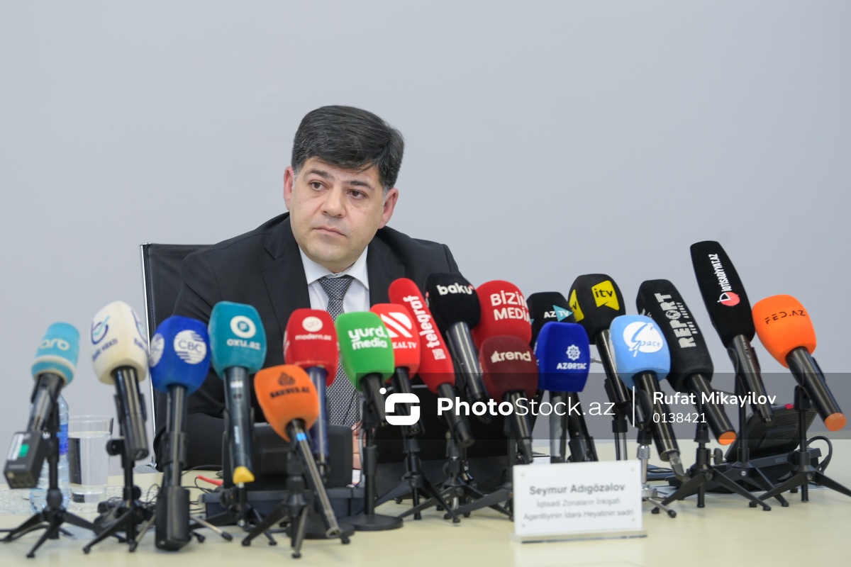 İqtisadiyyat Nazirliyi yanında İqtisadi Zonaların İnkişafı Agentliyinin 2025-ci ilin yekunlarına həsr olunmuş mətbuat konfransında çıxış edən Agentliyin İdarə Heyətinin sədri Seymur Adıgözəlov.