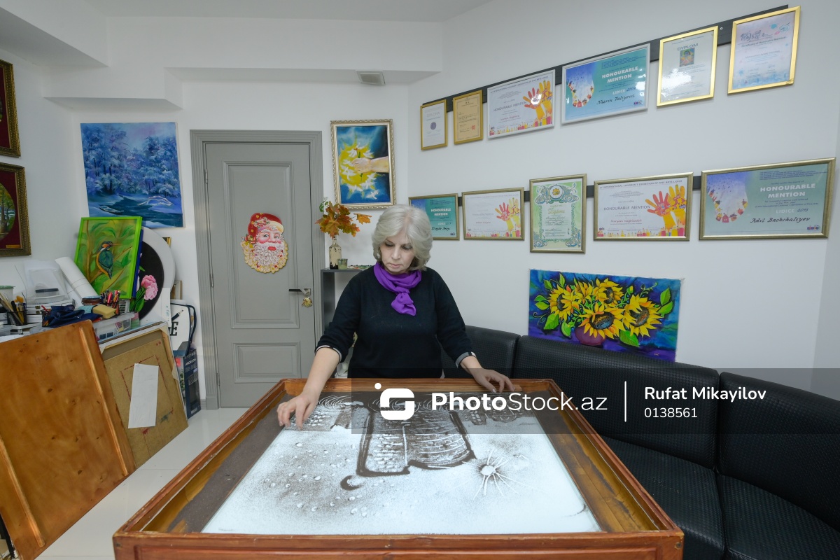 Rəssam Naqiyə Rzayevanın qumla yaratdığı sənət əsərləri