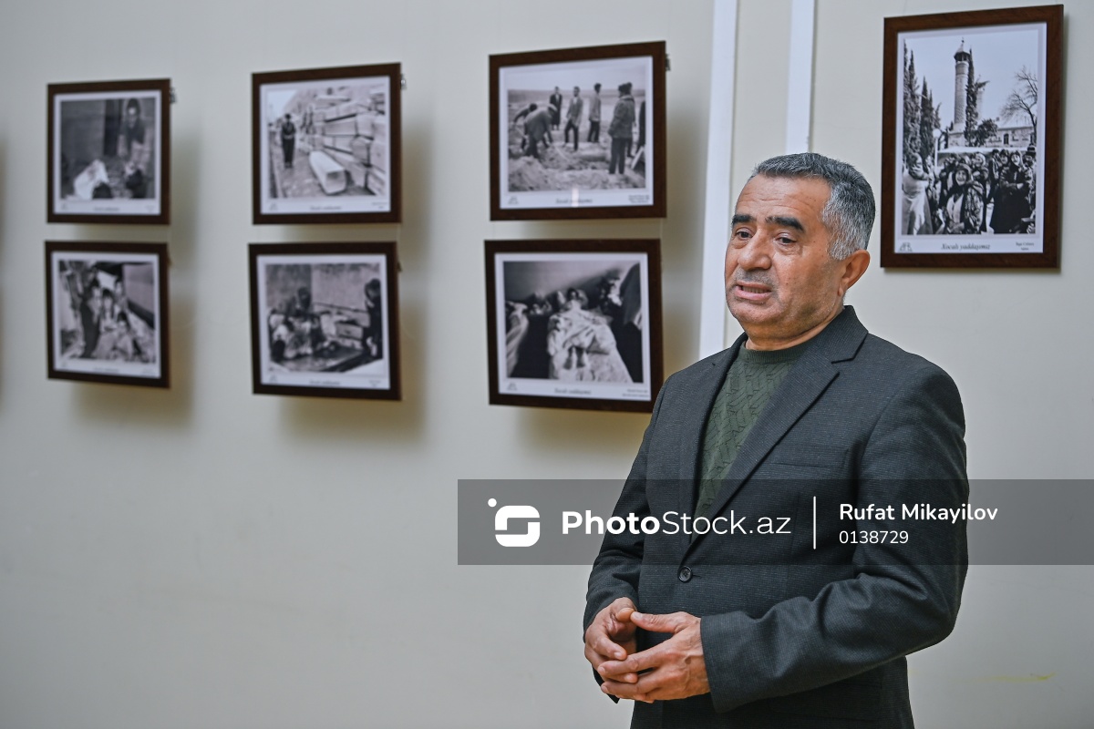 Xocalı faciəsinin 34-cü ildönümünə həsr olunmuş "Zamanı dayandıran gecə" adlı fotosərgidə çıxış edən fotoqraf Mirnaib Həsənoğlu.