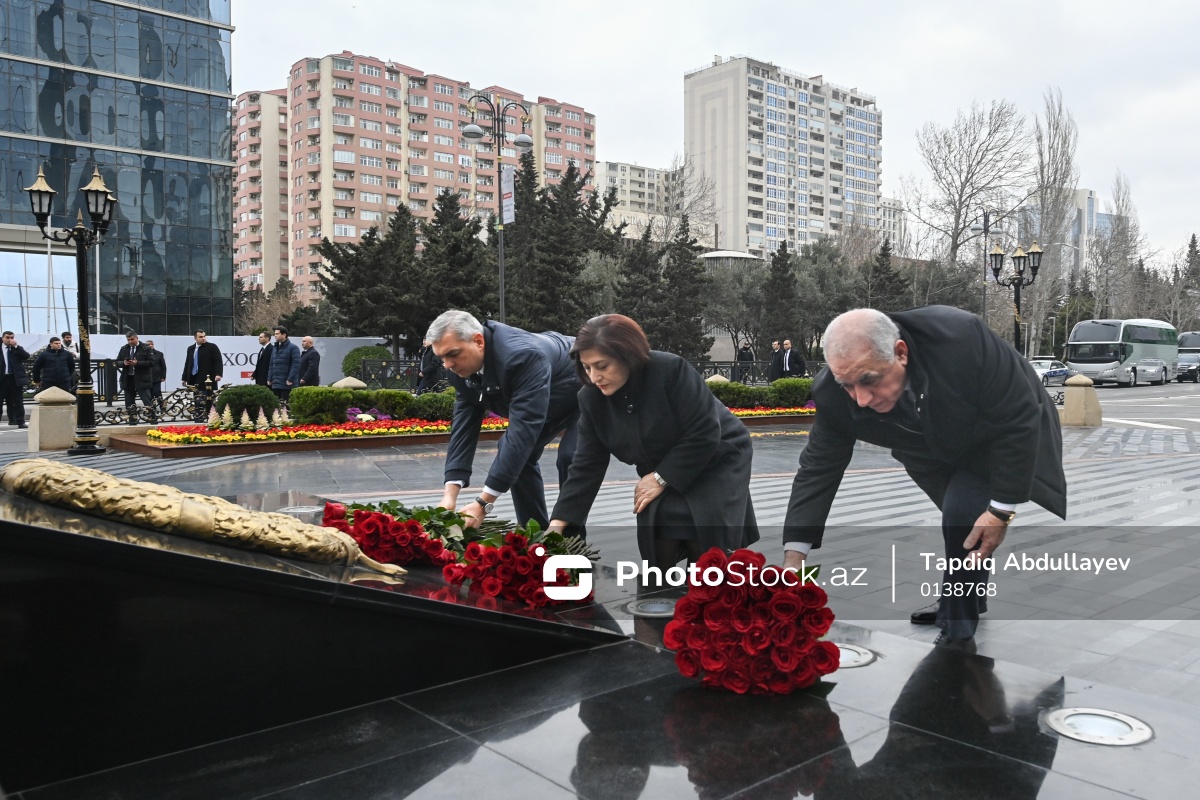 Xocalı faciəsinin 34-cü ildönümü ilə əlaqədar "Ana harayı" abidəsini ziyarət edən (soldan-sağa) Azərbaycan Respublikası Prezidentinin Administrasiyasının rəhbəri Samir Nuriyev, Milli Məclisin sədri Sahibə Qafarova və Azərbaycan Respublikasının Baş naziri Əli Əsədov.