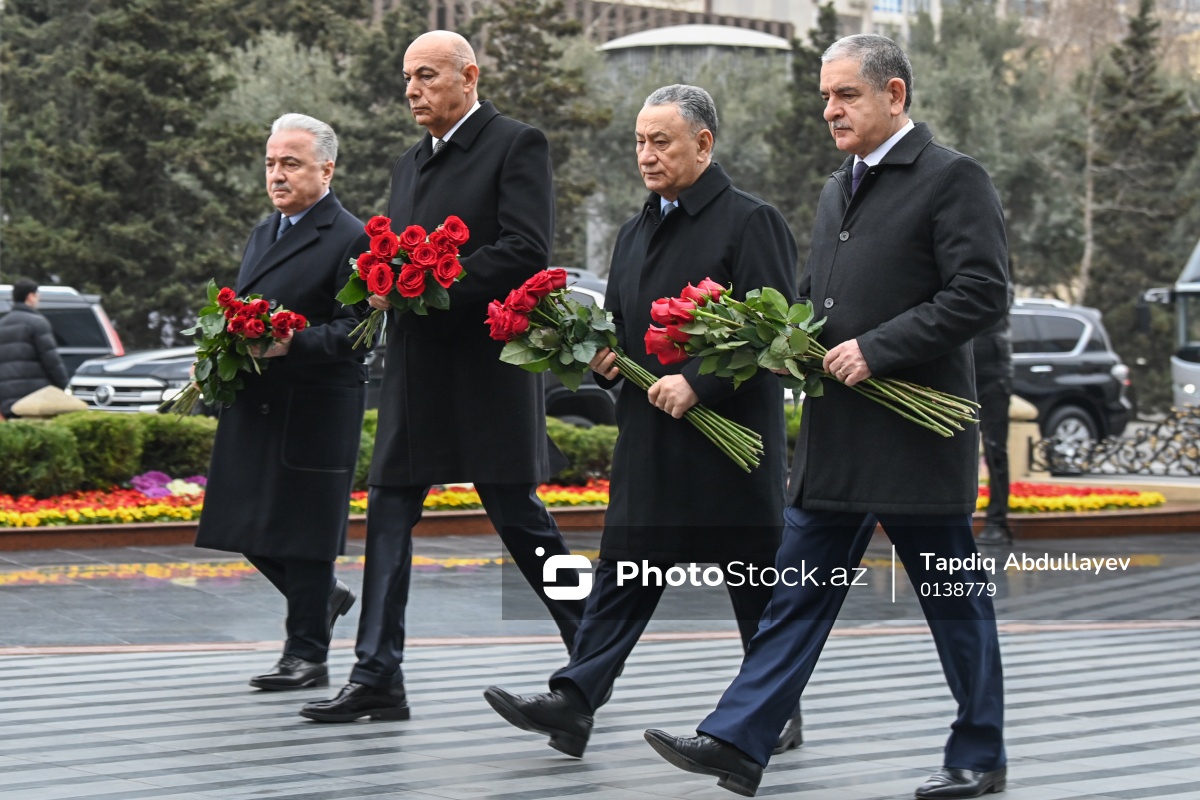 Xocalı faciəsinin 34-cü ildönümü ilə əlaqədar "Ana harayı" abidəsini ziyarət edən (soldan-sağa) Azərbaycan Respublikası Prezidentinin köməkçisi - Azərbaycan Respublikası Prezidentinin Administrasiyasının Ərazi-təşkilat məsələləri şöbəsinin müdiri Zeynal Nağdəliyev, Azərbaycan Respublikası Prezidentinin Administrasiyasının Siyasi partiyalar və qanunvericilik hakimiyyəti ilə əlaqələr şöbəsinin müdiri Ədalət Vəliyev, Azərbaycan Respublikasının Təhlükəsizlik Şurasının katibi Ramil Usubov və Azərbaycan Respublikası Prezidentinin köməkçisi - Azərbaycan Respublikası Prezidentinin Administrasiyasının İqtisadi siyasət və sənaye məsələləri şöbəsinin müdiri Natiq Əmirov.