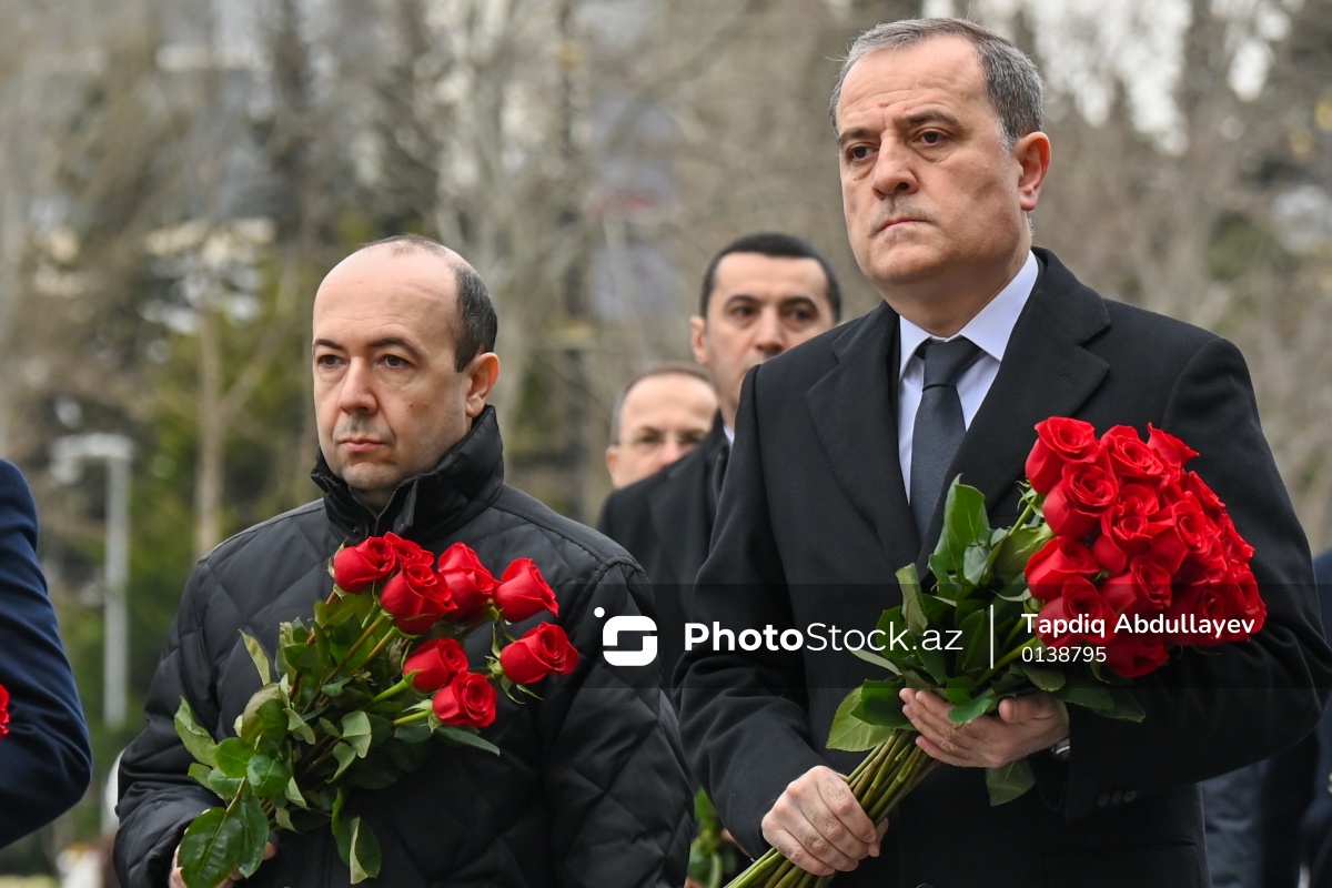 Xocalı faciəsinin 34-cü ildönümü ilə əlaqədar "Ana harayı" abidəsini ziyarət edən Azərbaycan Respublikası xarici işlər nazirinin müavini Fariz Rzayev (sol) və xarici işlər naziri Ceyhun Bayramov (sağ).