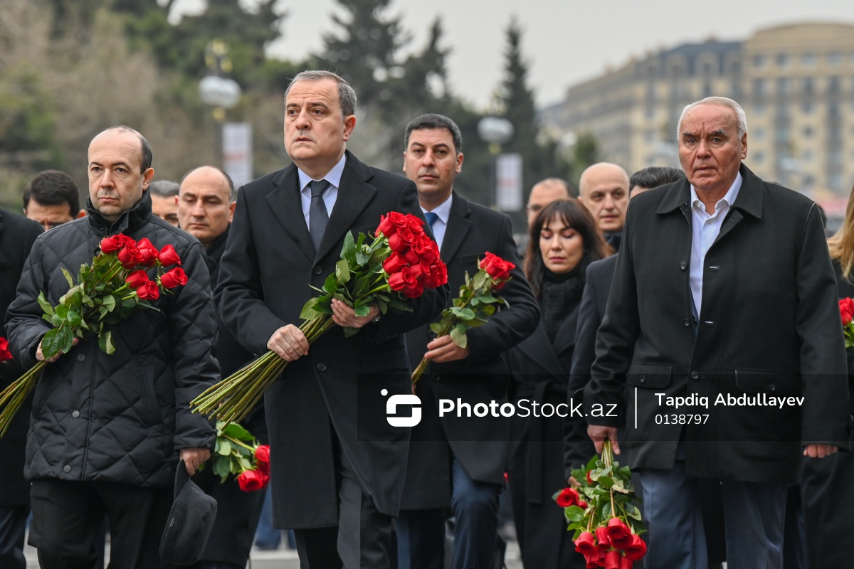 Xocalı faciəsinin 34-cü ildönümü ilə əlaqədar "Ana harayı" abidəsini ziyarət edən (soldan-sağa) Azərbaycan Respublikası xarici işlər nazirinin müavini Fariz Rzayev, xarici işlər naziri Ceyhun Bayramov və müavini Mahmud Məmmədquliyev.