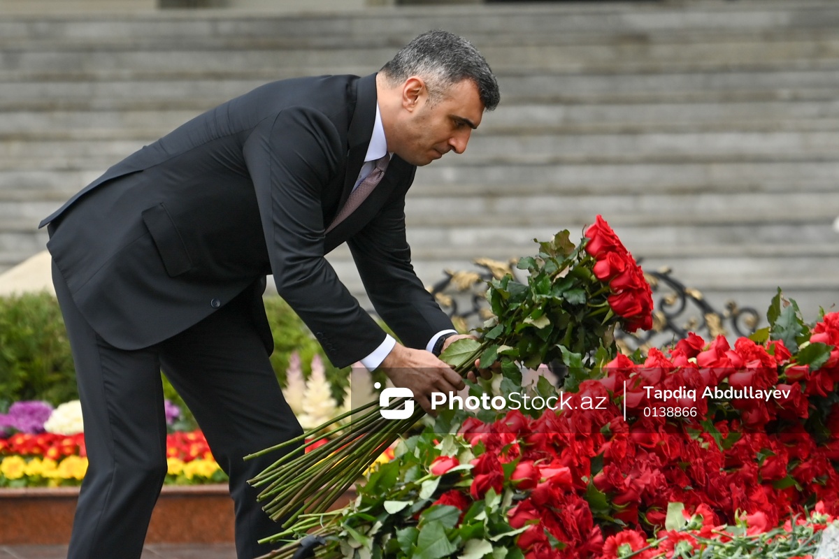 Xocalı faciəsinin 34-cü ildönümü ilə əlaqədar "Ana harayı" abidəsini ziyarət edən Azərbaycan Respublikası Mərkəzi Bankının sədri Taleh Kazımov.