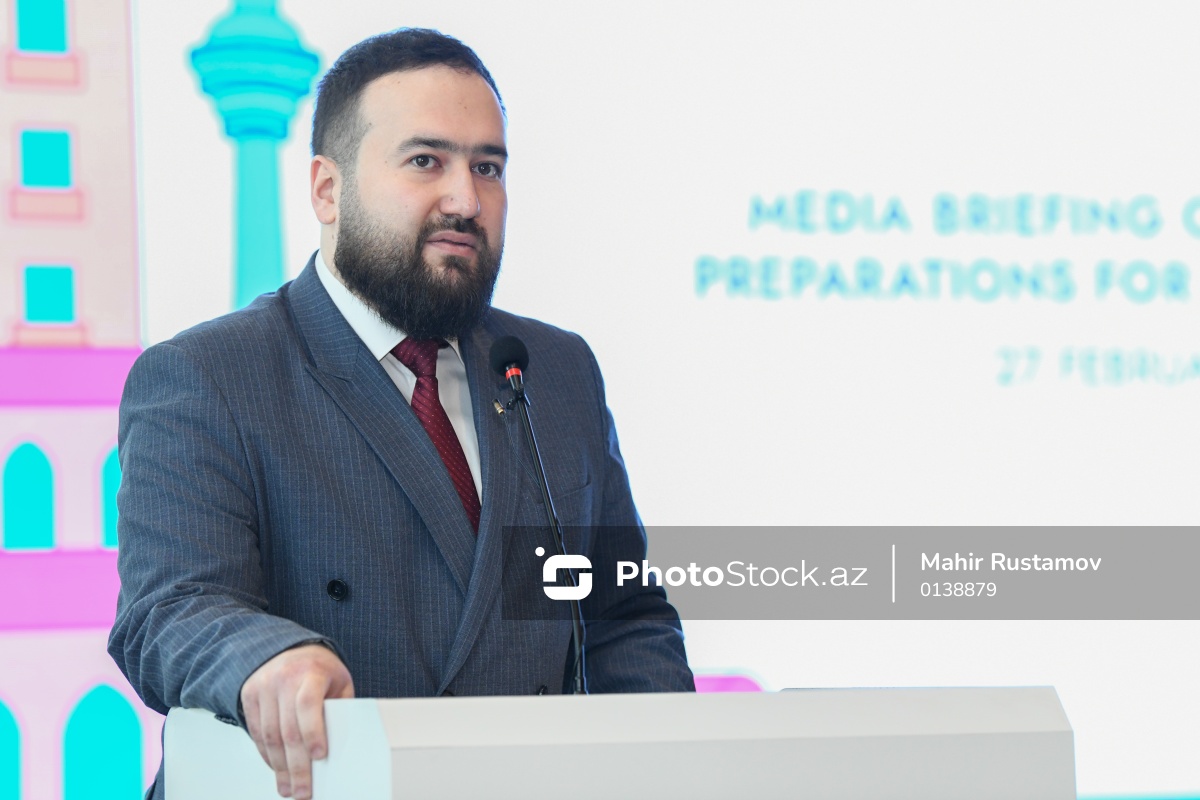Ümumdünya Şəhərsalma Forumunun On Üçüncü sessiyasına (WUF13) hazırlıq prosesinə həsr olunmuş brifinqdə çıxış edən WUF13-un Azərbaycan Əməliyyat Şirkətinin Media Əlaqələri üzrə Meneceri Eldar Rəsulov.