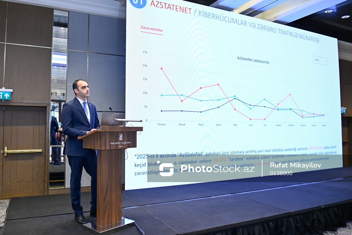 "İnformasiya təhlükəsizliyi riskləri və onların idarə edilməsi" adlı tədbirdə çıxış edən Xüsusi Rabitə və İnformasiya Təhlükəsizliyi Dövlət Xidmətinin idarə rəisi Nadir Novruzov.