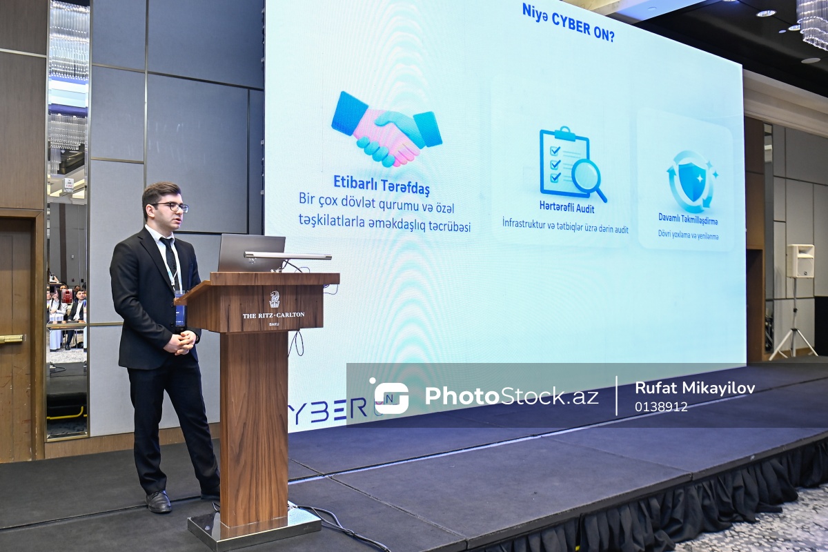 "İnformasiya təhlükəsizliyi riskləri və onların idarə edilməsi" adlı tədbirdə çıxış edən "Cyber ON" şirkətinin İdarəetmə, Risk və Komplayens üzrə mütəxəssisi Raul Ömərov.