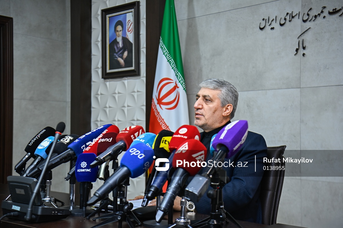 İran İslam Respublikasının Azərbaycandakı Konsulluq Şöbəsində keçirilən mətbuat konfransında çıxış edən İran İslam Respublikasının Azərbaycandakı səfiri Müctəba Dəmirçilu.