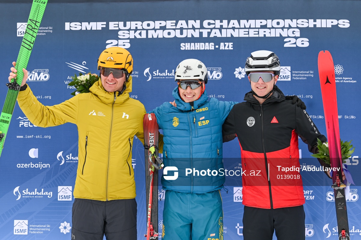 Xizək Alpinizmi üzrə Avropa Çempionatında U-20 kateqoriyası üzrə sprint yarışlarında iştirak edən (soldan-sağa) gümüş medal mükafatçısı Marek Foltin, qızıl medal mükafatçısı Aaron Alvares və bürünc medal mükafatçısı Morits Bauregger.