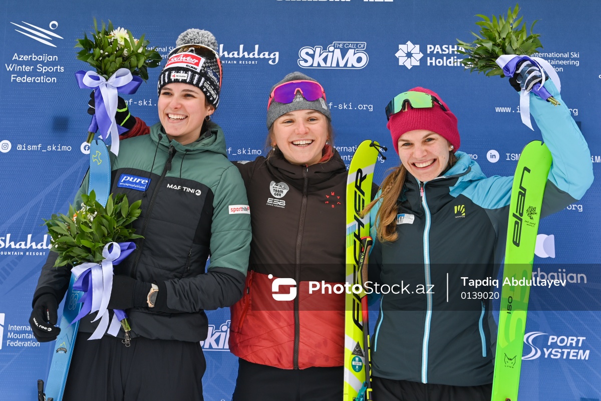 Xizək Alpinizmi üzrə Avropa Çempionatında U-20 kateqoriyası üzrə sprint yarışlarında iştirak edən (soldan-sağa) gümüş medal mükafatçısı Emma Albrext, qızıl medal mükafatçısı Helena Öringer və bürünc medal mükafatçısı Klara Velepeç.
