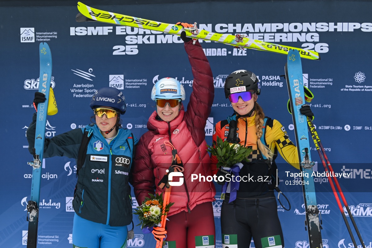 Xizək Alpinizmi üzrə Avropa Çempionatında sprint yarışlarında iştirak edən (soldan-sağa) gümüş medal mükafatçısı Culiya Murada, qızıl medal mükafatçısı Marianne Fatton və bürünc medal mükafatçısı Tatyana Paller.