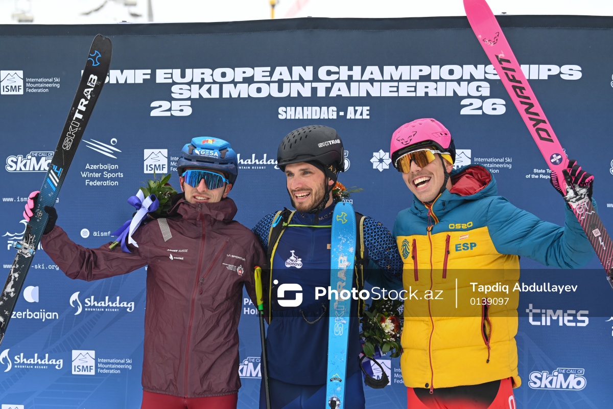 Xizək Alpinizmi üzrə Avropa Çempionatında sprint yarışlarında iştirak edən (soldan-sağa) gümüş medal mükafatçısı Tomas Bussard, qızıl medal mükafatçısı Nikita Filippov və bürünc medal mükafatçısı Martines Ferrer.