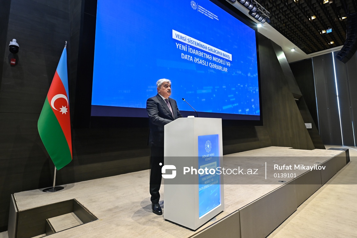 "Vergi sistemində gələcəyə baxış: yeni idarəetmə modeli və data əsaslı qərarlar" mövzusunda forumda çıxış edən Baş nazirin müavini Samir Şərifov.