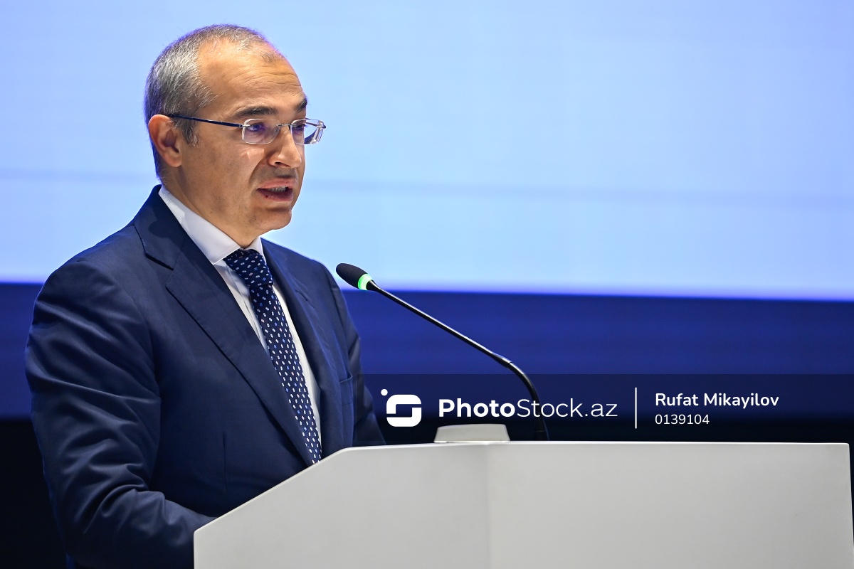 "Vergi sistemində gələcəyə baxış: yeni idarəetmə modeli və data əsaslı qərarlar" mövzusunda forumda çıxış edən Azərbaycan Respublikasının iqtisadiyyat naziri Mikayıl Cabbarov.