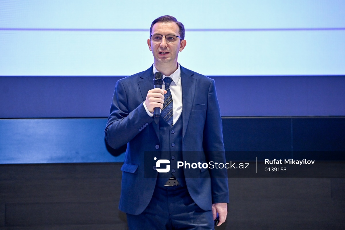 "Vergi sistemində gələcəyə baxış: yeni idarəetmə modeli və data əsaslı qərarlar" mövzusunda forumda çıxış edən İqtisadiyyat Nazirliyi yanında Dövlət Vergi Xidmətinin Data analitika idarəsinin rəisi Roman Bandurin.
