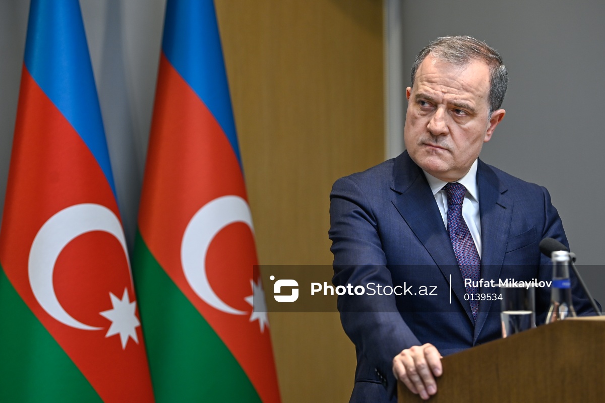 Bakıda keçirilən mətbuat konfransında çıxış edən Azərbaycan Respublikasının xarici işlər naziri Ceyhun Bayramov.