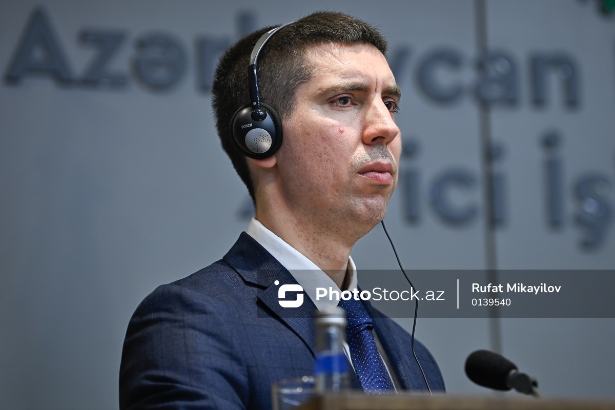 Bakıda keçirilən mətbuat konfransında çıxış edən Moldovanın Baş nazirinin müavini, xarici işlər naziri Mixay Popşoi.