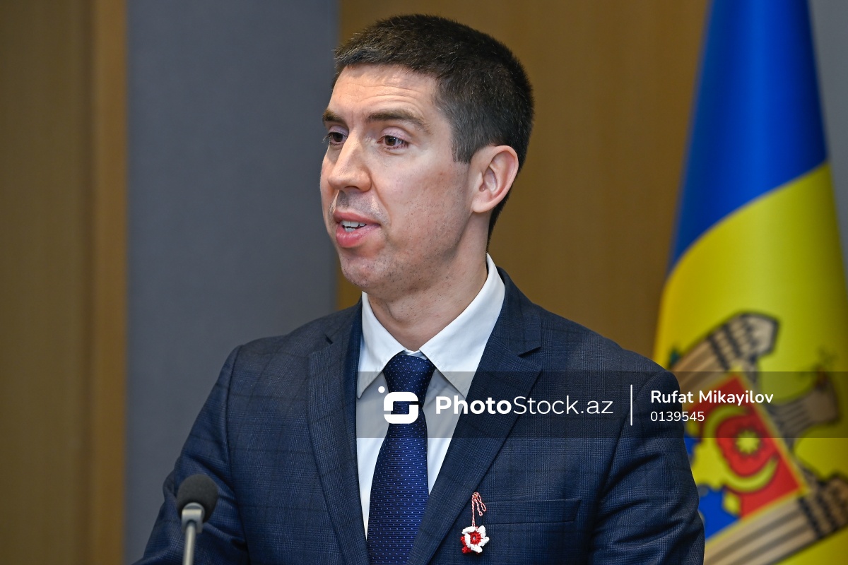 Bakıda keçirilən mətbuat konfransında çıxış edən Moldovanın Baş nazirinin müavini, xarici işlər naziri Mixay Popşoi.