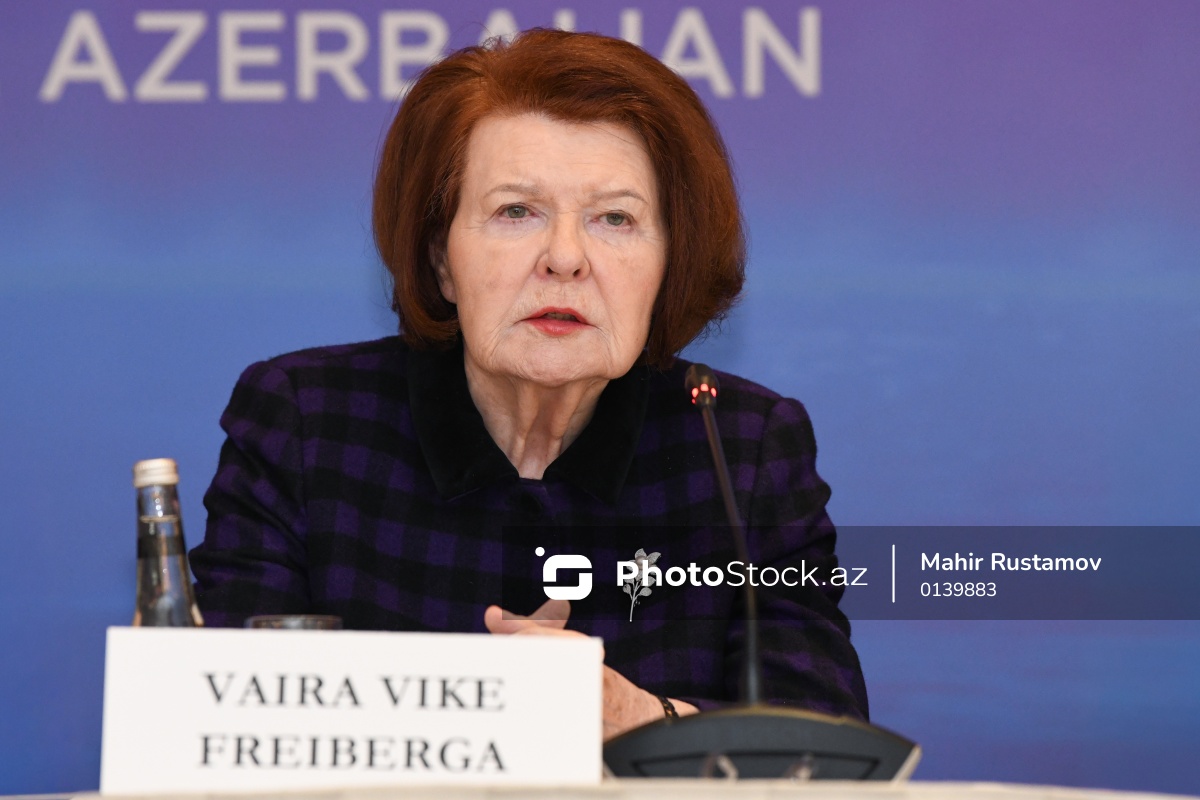 XIII Qlobal Bakı Forumuna həsr olunmuş mətbuat konfransında çıxış edən Latviyanın sabiq Prezidenti Vayra Vike-Frayberqa.