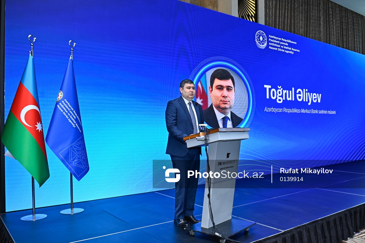 “Müasir rəqəmsal dünyada istehlakçılar: elektron ticarət, rəqəmsal xidmətlər və təhlükəsizlik məsələləri” mövzusunda forumda çıxış edən Azərbaycan Respublikası Mərkəzi Bankı sədrinin müavini Toğrul Əliyev.