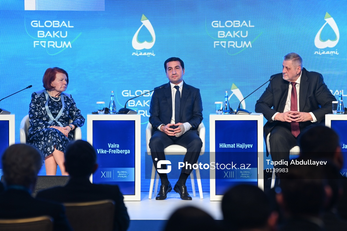 XIII Qlobal Bakı Forumunda iştirak edən (soldan-sağa) Latviyanın sabiq Prezidenti Vayra Vike-Frayberqa, Azərbaycan Respublikası Prezidentinin köməkçisi - Azərbaycan Respublikası Prezidentinin Administrasiyasının Xarici siyasət məsələləri şöbəsinin müdiri Hikmət Hacıyev və Slovakiya Prezidentinin xarici siyasət məsələləri üzrə köməkçisi Yan Kubiş.