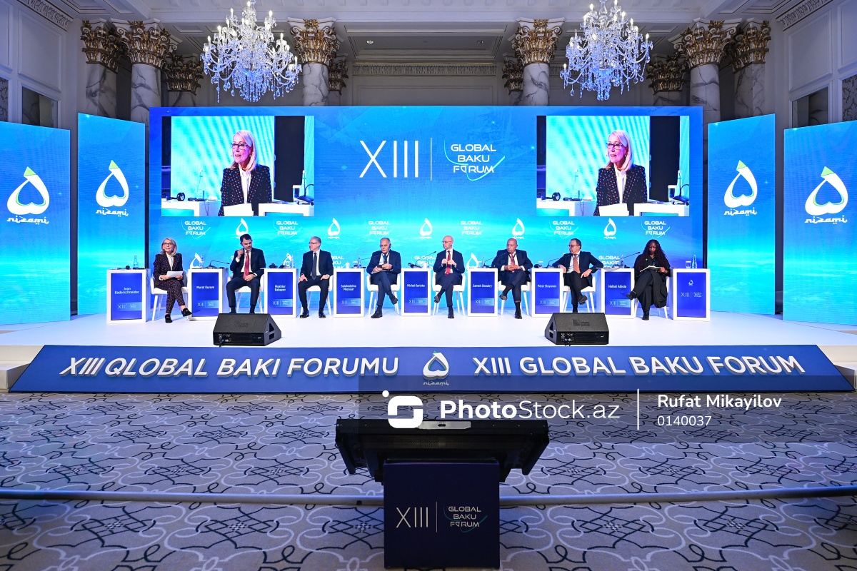 XIII Qlobal Bakı Forumunun ikinci günündə iştirak edən (soldan-sağa) "ExxonMobil" şirkətinin sabiq vitse-prezidenti Cin Badersşnayder, Türkiyənin ekologiya, şəhərsalma və iqlim dəyişiklikləri naziri, COP31 Prezidenti Murat Kurum, Azərbaycan Prezidentinin iqlim məsələləri üzrə nümayəndəsi, COP29-un Prezidenti Muxtar Babayev, COP22-nin prezidenti, Mərakeşin xarici işlər və əməkdaşlıq naziri Səlahəddin Mezouar, COP24-ün prezidenti, Polşanın sabiq ətraf mühit naziri müavini Mixal Kurtıka, Misirin sabiq xarici işlər naziri, COP27-nin prezidenti Sameh Şükri, Bolqarıstanın sabiq Prezidenti Petar Stoyanov və "Vital Voices Global Partnership" təşkilatında İqlim Ədaləti Proqramının rəhbəri, "Women in Africa Initiative" təşkilatının prezidenti Hafsat Abiola.