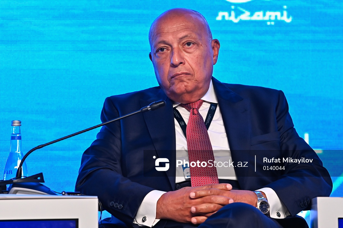 XIII Qlobal Bakı Forumunun ikinci günündə çıxış edən Misirin sabiq xarici işlər naziri, COP27-nin prezidenti Sameh Şükri.