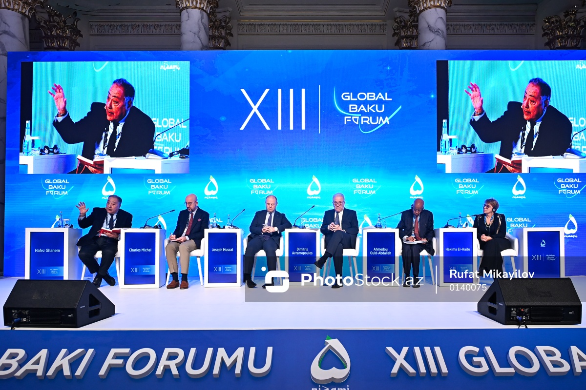XIII Qlobal Bakı Forumunun ikinci günündə iştirak edən (soldan-sağa) Dünya Bankının Şərqi və Cənubi Afrika üzrə sabiq regional vitse-prezidenti Hafez Qanem, Avropa İttifaqı Şurasının sabiq Prezidenti Şarl Mişel, Maltanın sabiq Baş naziri Cozef Muskat, Miqrasiya, Daxili İşlər və Vətəndaşlıq üzrə sabiq Avropa Komissarı Dimitris Avramopulos, 2003-2007-ci illərdə Qərbi Afrika üzrə BMT Baş katibinin xüsusi nümayəndəsi, 2007-2010-cu illərdə BMT-nin Somali üzrə xüsusi elçisi Ahmedou Ould-Abdallah, “Liberal Internasional”ın prezidenti, COP21-in vitse-prezidenti, Mərakeş Krallığının 2015-2017-ci illər üzrə iqlim dəyişikliyi üzrə xüsusi elçisi və COP22-nin yüksək səviyyəli iqlim çempionu Hakima El-Haite.