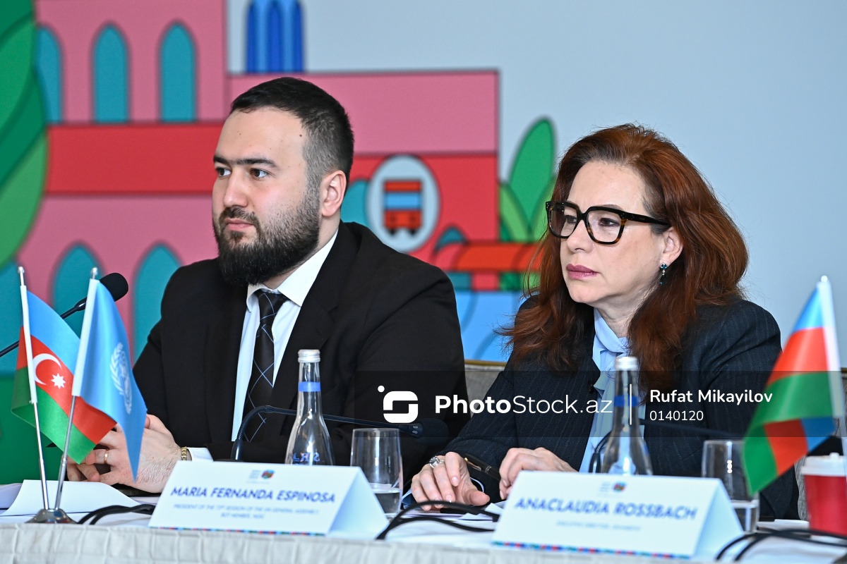 Ümumdünya Şəhərsalma Forumunun 13-cü sessiyasına həsr olunmuş brifinqdə iştirak edən WUF13 Azərbaycan Əməliyyat Şirkətinin Media Əlaqələri üzrə Meneceri Eldar Rəsulov (sol), BMT Baş Assambleyasının 73-cü sessiyasının prezidenti Maria Fernanda Espinosa (sağ).