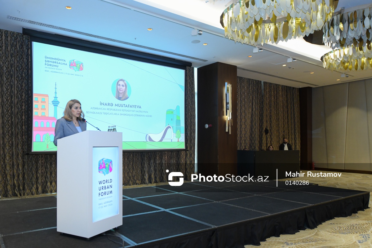 "AZS ISO 20121:2026 - Tədbir davamlılığının idarəetmə sistemləri" üzrə dövlət standartının təqdimatında çıxış edən Azərbaycan Respublikası İqtisadiyyat Nazirliyinin Beynəlxalq təşkilatlarla əməkdaşlıq şöbəsinin müdiri İnarə Mustafayeva.