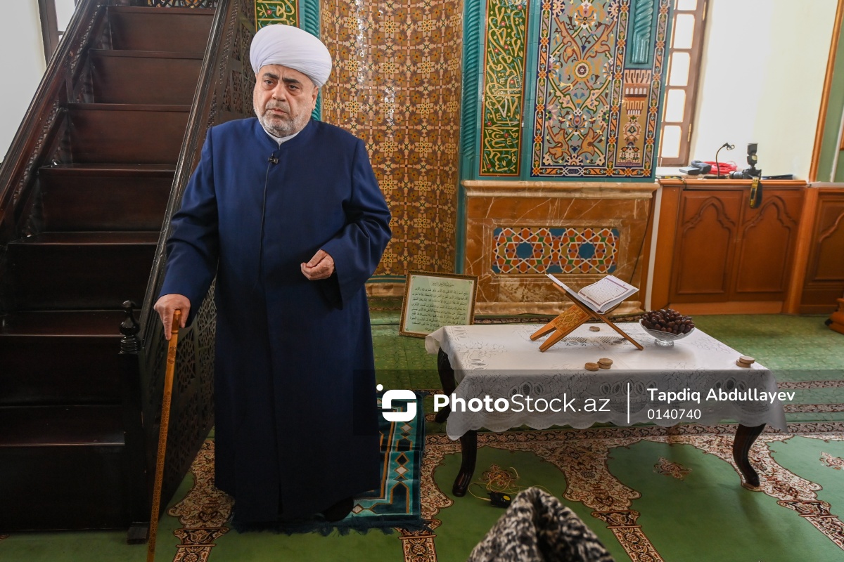 Ramazan bayramı münasibətilə Təzəpir məscidində qılınan bayram namazında iştirak edən Qafqaz Müsəlmanları İdarəsinin sədri şeyxülislam Allahşükür Paşazadə.
