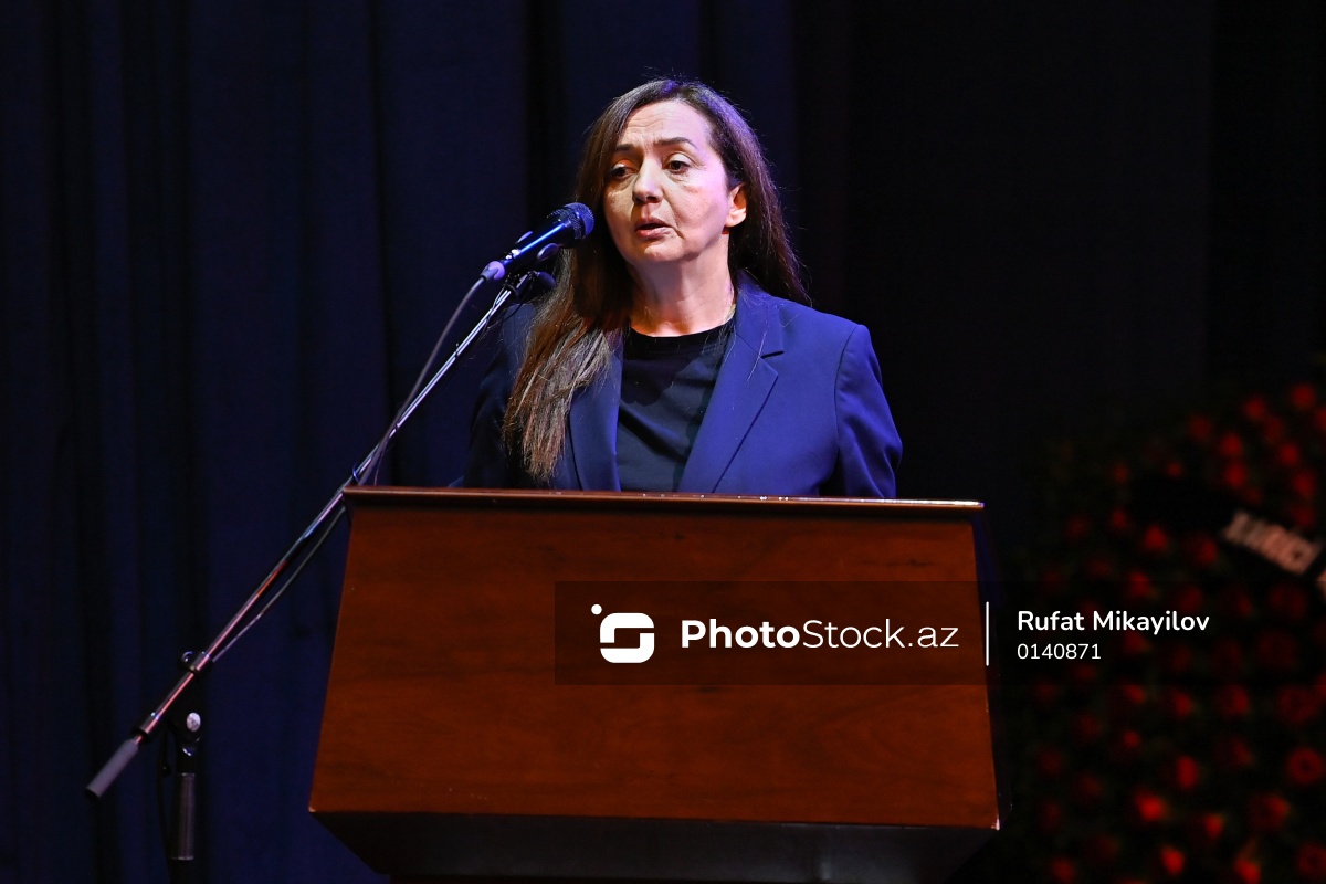 Xalq artisti Rasim Balayevin vida mərasimində çıxış edən Mədəniyyət Nazirliyinin Media və Kommunikasiya şöbəsinin müdiri Aynur Kərimova.