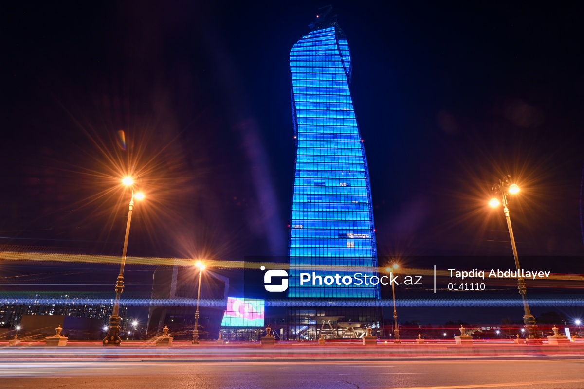 Dünya Autizm Maarifləndirmə Günü ilə əlaqədar mavi rənglə işıqlandırılan "SOCAR Tower".