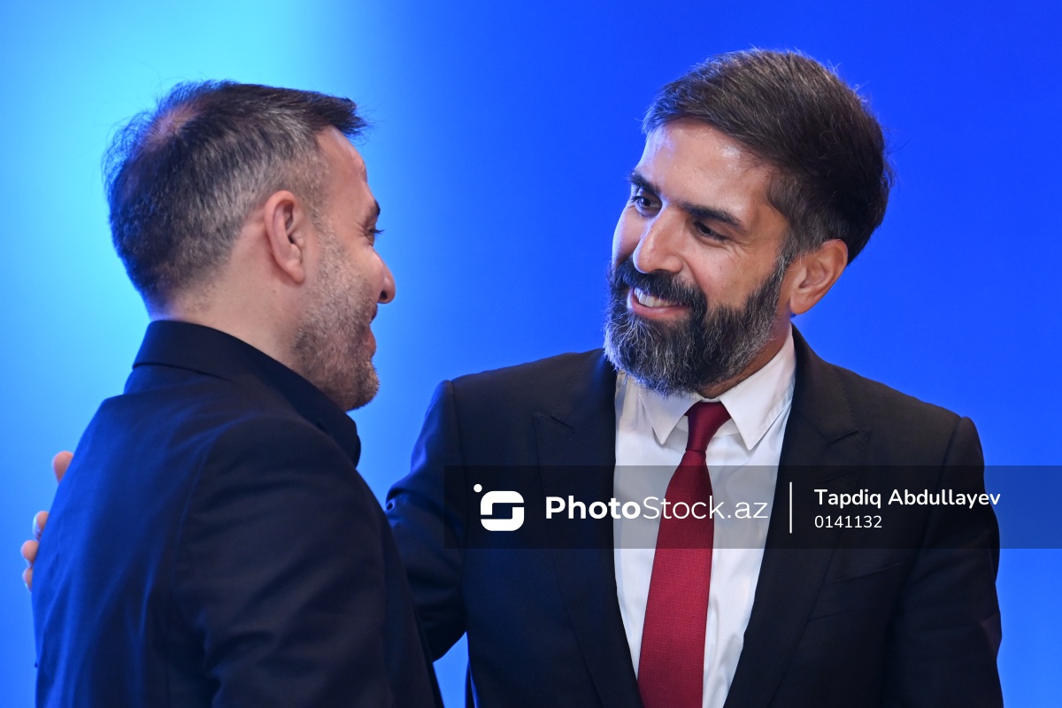 AFFA-nın Hesabat Konfransında iştirak edən Azərbaycan millisinin baş məşqçisi Ayxan Abbasov (sol) və AFFA-nın prezidenti Rövşən Nəcəf (sağ).