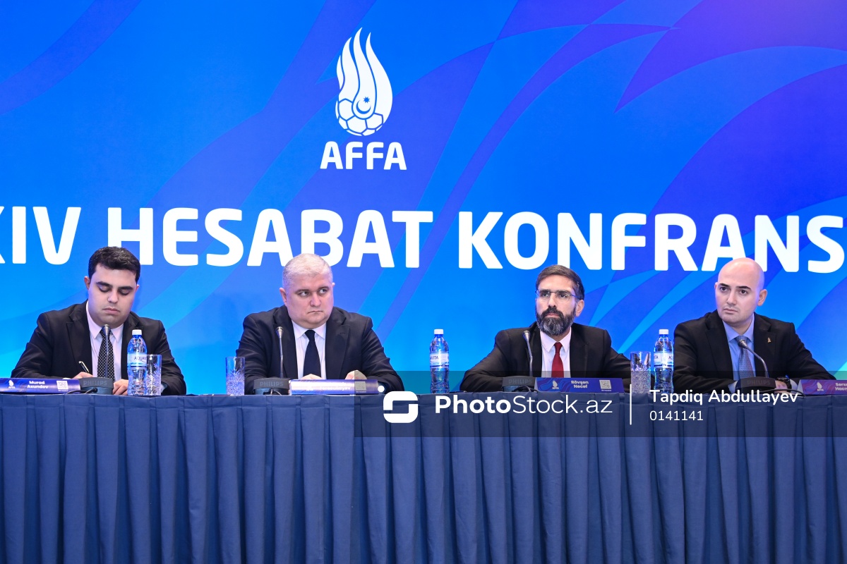AFFA-nın mətbuat konfransında iştirak edən (soldan-sağa) AFFA-nın mətbuat katibi Murad Axundov, baş katibi Cahangir Fərəcullayev, prezidenti Rövşən Nəcəf və icraçı vitse-prezidenti Sərxan Hacıyev.