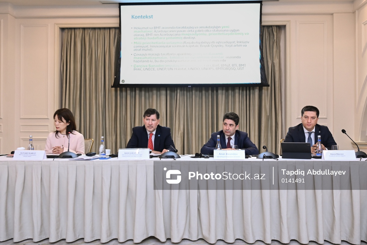 Birləşmiş Millətlər Təşkilatının (BMT) Davamlı İnkişaf üzrə Əməkdaşlıq Çərçivəsinin Yüksək Səviyyəli Birgə Rəhbər Komitəsinin iclasında iştirak edən (soldan-sağa) BMT-nin Azərbaycandakı rezident koordinatoru ofisinin rəhbəri Kanako Mabuçi, BMT-nin Azərbaycandakı müvəqqəti rezident-əlaqələndiricisi İqor Qarafuliç, Azərbaycan Respublikasının iqtisadiyyat nazirinin müavini Anar Axundov və iqtisadiyyat nazirinin müşaviri Hüseyn Hüseynov.