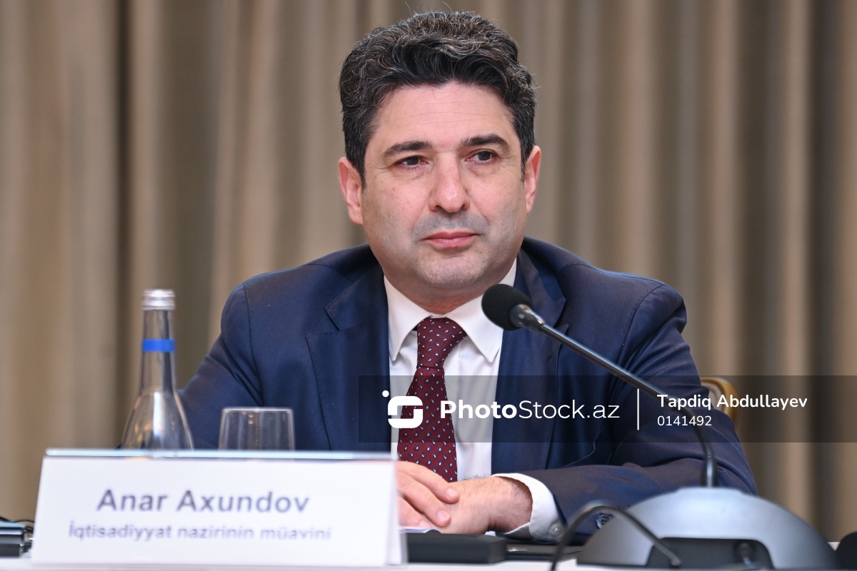 Birləşmiş Millətlər Təşkilatının (BMT) Davamlı İnkişaf üzrə Əməkdaşlıq Çərçivəsinin Yüksək Səviyyəli Birgə Rəhbər Komitəsinin iclasında çıxış edən Azərbaycan Respublikasının iqtisadiyyat nazirinin müavini Anar Axundov.