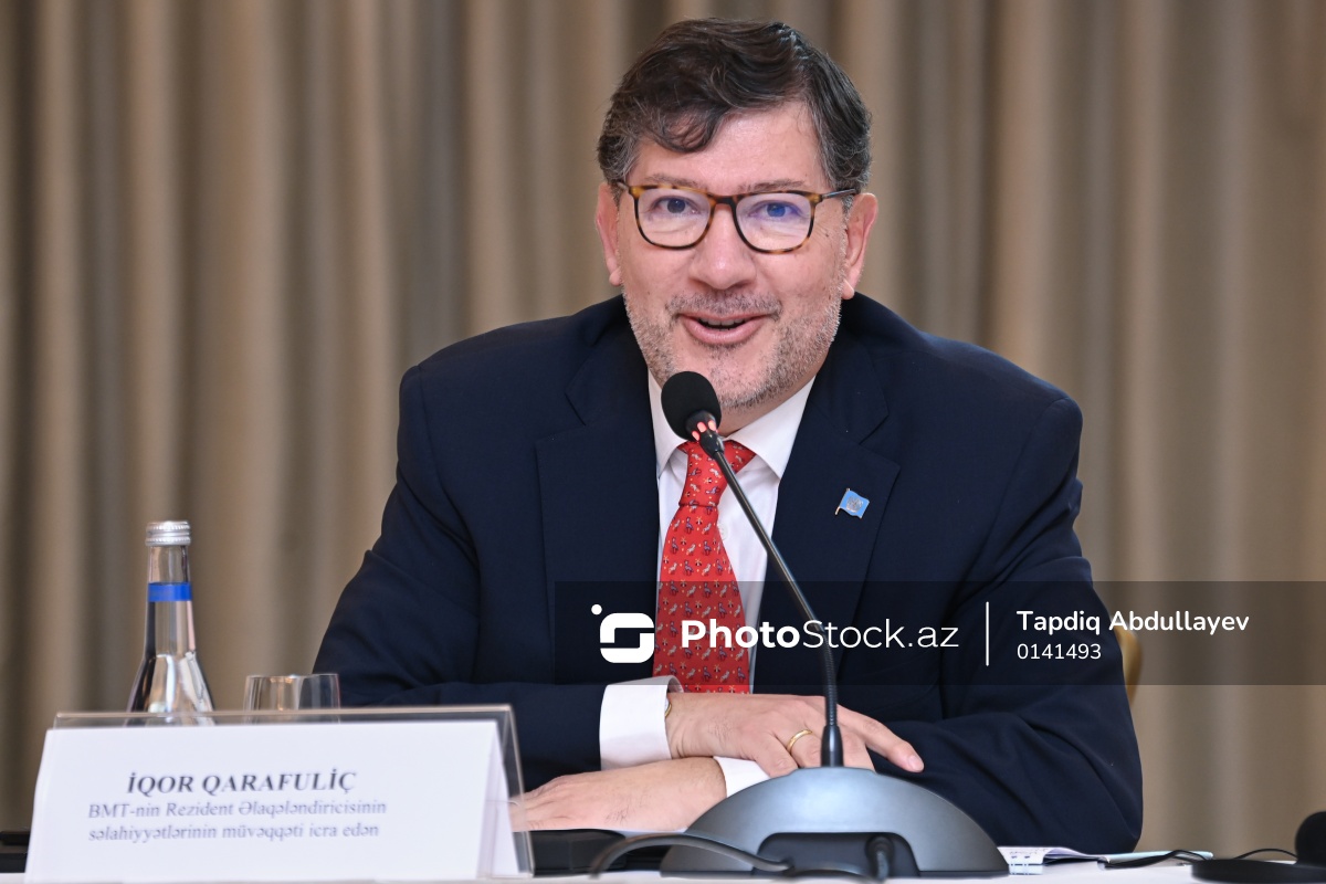 Birləşmiş Millətlər Təşkilatının (BMT) Davamlı İnkişaf üzrə Əməkdaşlıq Çərçivəsinin Yüksək Səviyyəli Birgə Rəhbər Komitəsinin iclasında çıxış edən BMT-nin Azərbaycandakı müvəqqəti rezident-əlaqələndiricisi İqor Qarafuliç.