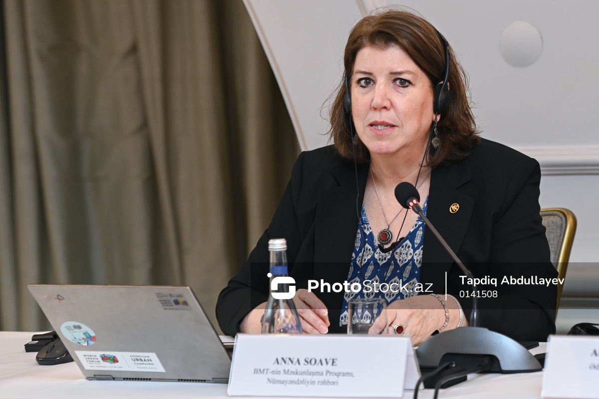 Birləşmiş Millətlər Təşkilatının (BMT) Davamlı İnkişaf üzrə Əməkdaşlıq Çərçivəsinin Yüksək Səviyyəli Birgə Rəhbər Komitəsinin iclasında çıxış edən BMT-nin Məskunlaşma Proqramının (UN-Habitat) Azərbaycan üzrə rəhbəri Anna Soave.