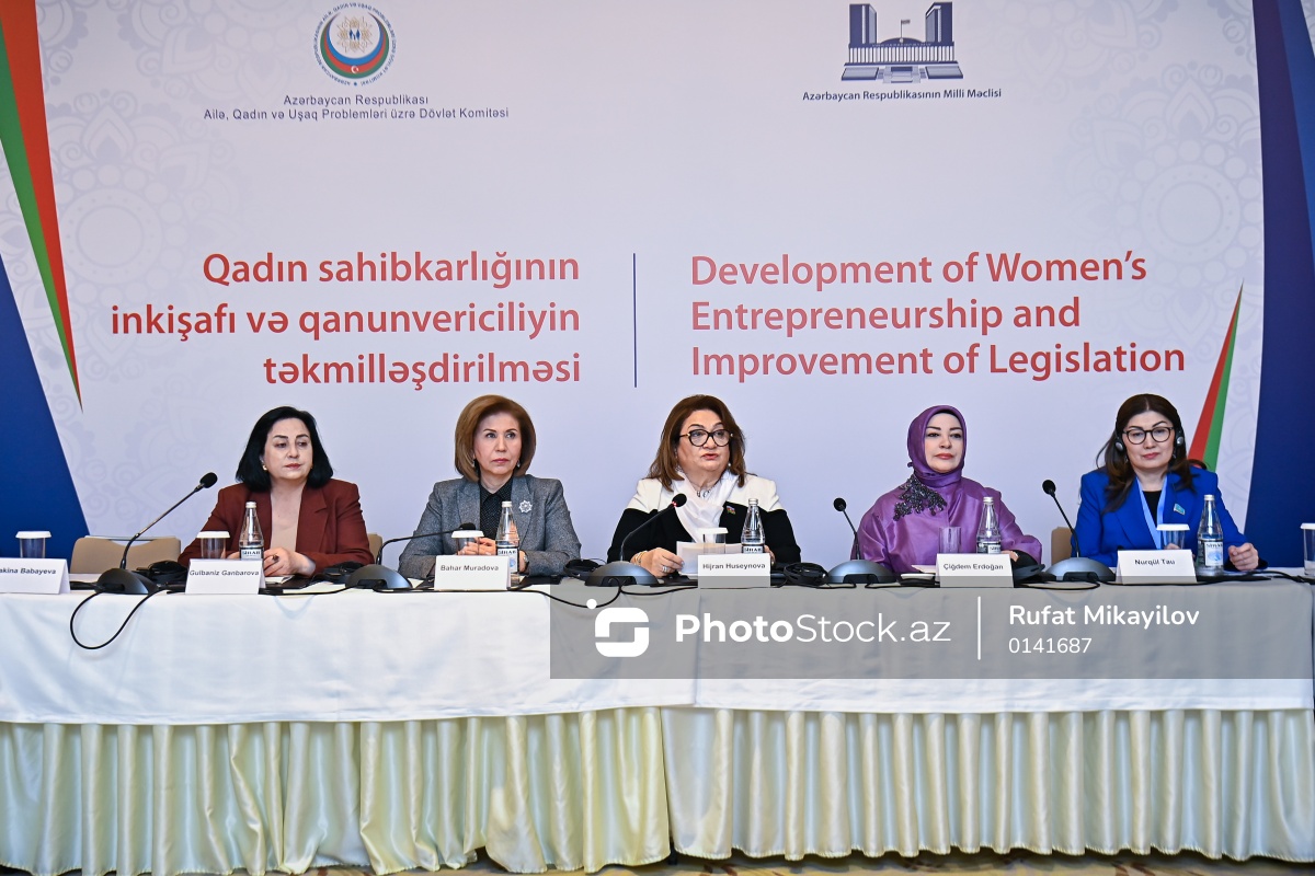 "AQEM məkanında davamlı inkişaf naminə qadınların səslərinin gücləndirilməsi" mövzusunda beynəlxalq konfransda iştirak edən (soldan-sağa) Azərbaycan Kənd Qadınları Assosiasiyasının sədri Gülbəniz Qənbərova, Ailə, Qadın və Uşaq Problemləri üzrə Dövlət Komitəsinin sədri Bahar Muradova, Milli Məclisin Ailə, qadın və uşaq məsələləri komitəsinin sədri Hicran Hüseynova, Türkiyə Böyük Millət Məclisinin (TBMM) Qadın və Kişi Bərabər İmkanlar Komitəsinin sədri Çiğdem Erdoğan və Qazaxıstan Məclisinin sosial və mədəni inkişaf komitəsinin katibi Nurgül Tau.