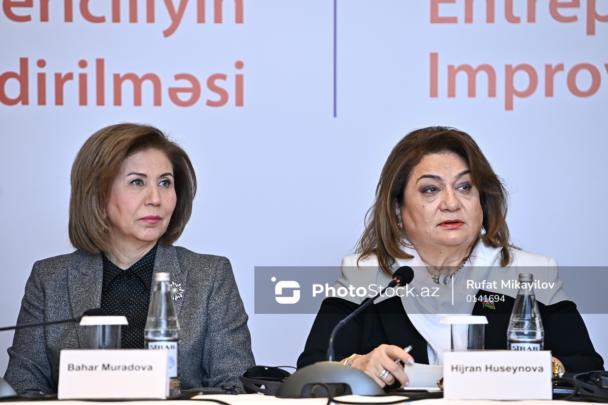"AQEM məkanında davamlı inkişaf naminə qadınların səslərinin gücləndirilməsi" mövzusunda beynəlxalq konfransda iştirak edən Ailə, Qadın və Uşaq Problemləri üzrə Dövlət Komitəsinin sədri Bahar Muradova (sol) və Milli Məclisin Ailə, qadın və uşaq məsələləri komitəsinin sədri Hicran Hüseynova (sağ).