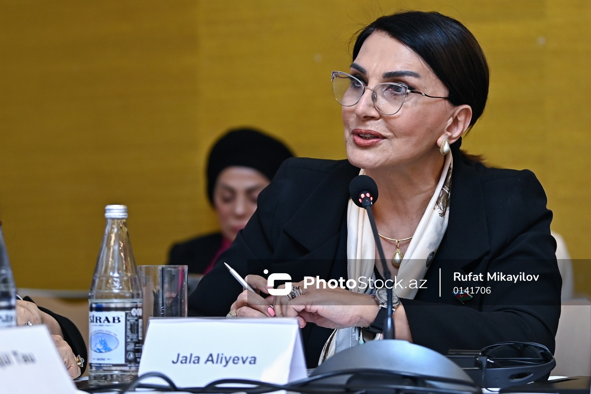 "AQEM məkanında davamlı inkişaf naminə qadınların səslərinin gücləndirilməsi" mövzusunda beynəlxalq konfransda çıxış edən Milli Məclisin deputatı Jalə Əliyeva.