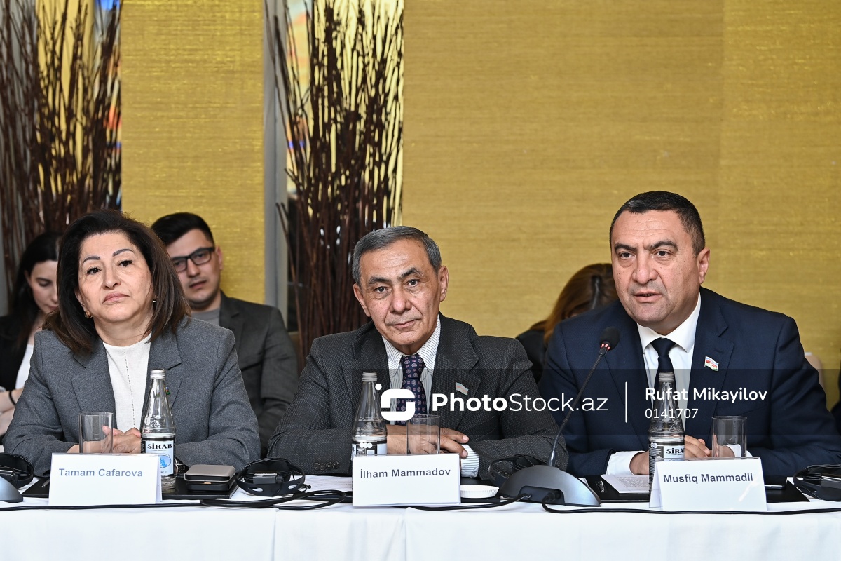 "AQEM məkanında davamlı inkişaf naminə qadınların səslərinin gücləndirilməsi" mövzusunda beynəlxalq konfransda iştirak edən (soldan-sağa) Milli Məclisin deputatları Tamam Cəfərova, İlham Məmmədov və Müşfiq Məmmədli.