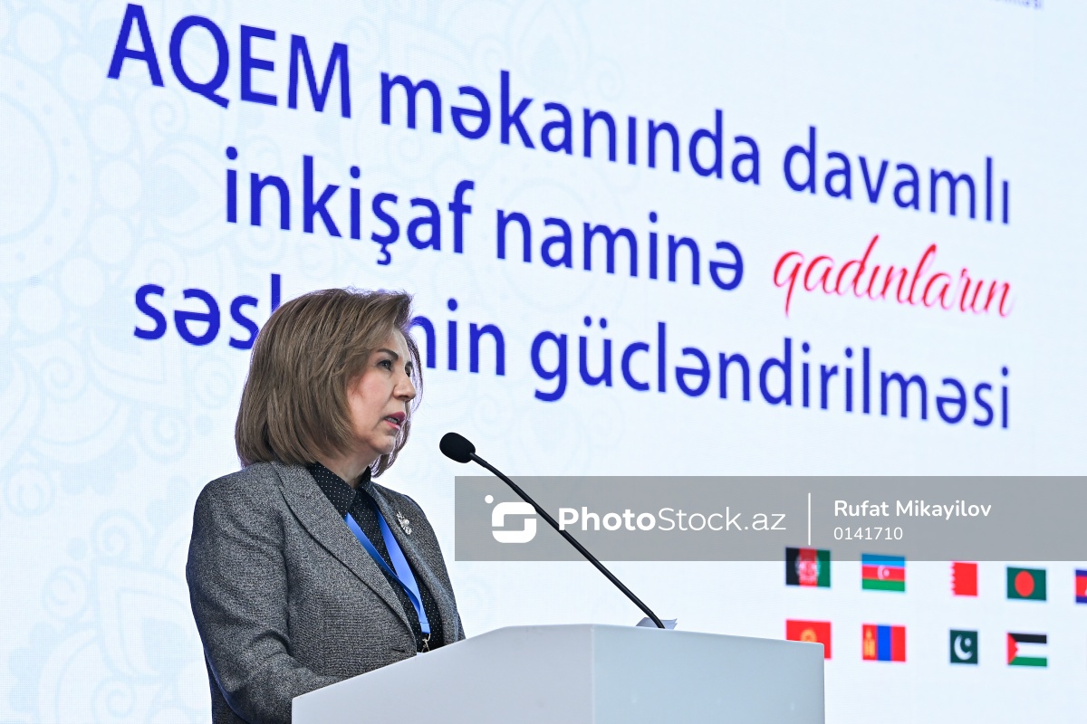 "AQEM məkanında davamlı inkişaf naminə qadınların səslərinin gücləndirilməsi" mövzusunda beynəlxalq konfransda çıxış edən Ailə, Qadın və Uşaq Problemləri üzrə Dövlət Komitəsinin sədri Bahar Muradova.