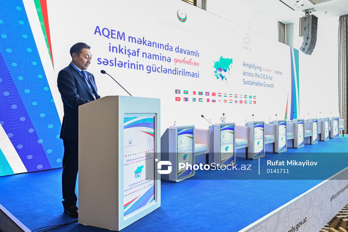 "AQEM məkanında davamlı inkişaf naminə qadınların səslərinin gücləndirilməsi" mövzusunda beynəlxalq konfransda çıxış edən AQEM-in Baş katibi Kayrat Sarıbay.
