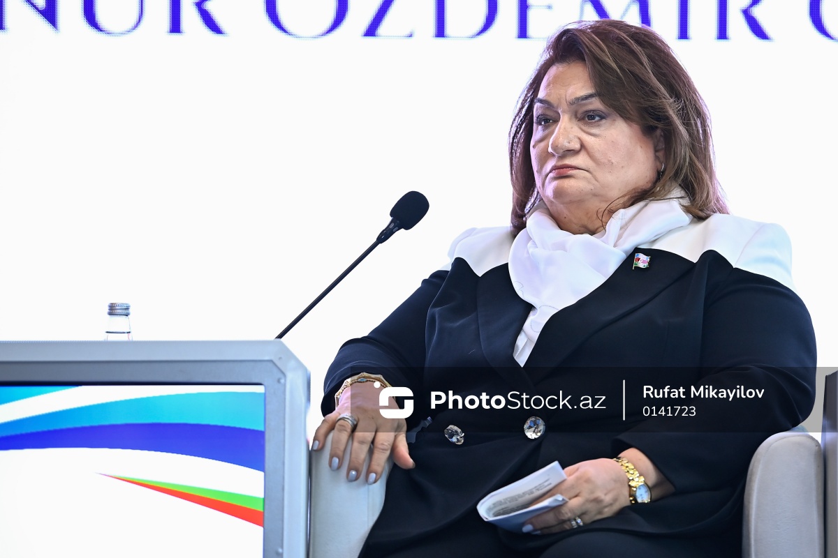 "AQEM məkanında davamlı inkişaf naminə qadınların səslərinin gücləndirilməsi" mövzusunda beynəlxalq konfransdakı "Kiçik və orta bizneslərdə (KOB) qadın sahibkarlar: süni intellekt və rəqəmsallaşmanın imkanlarından istifadə" adlı panel müzakirəsində çıxış edən Azərbaycan Respublikası Milli Məclisinin Ailə, qadın və uşaq məsələləri komitəsinin sədri Hicran Hüseynova.